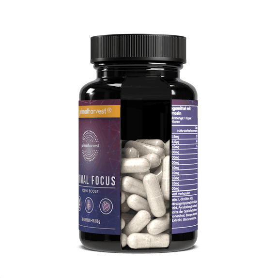 Die Kogni-Boost / Primal Focus Kapseln enthalten Cognizin® in Premium Qualität sowie L-Tyrosin. Cognizin® ist ein Markenwirkstoff mit Nährstoffen für deinen Fokus. [Mehr über Cognizin erfahren]