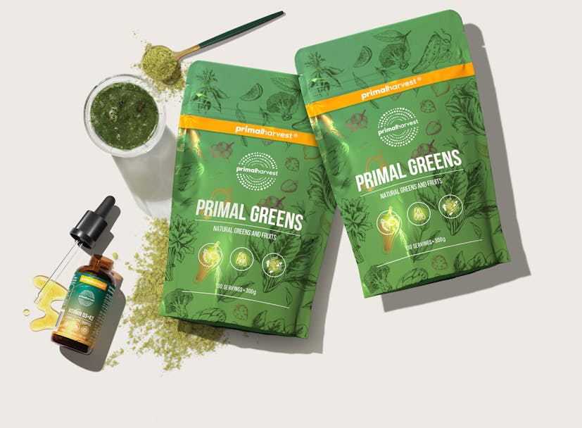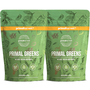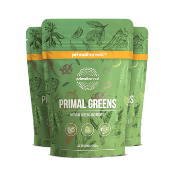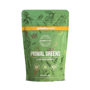 Primal Greens kombiniert eine Vielzahl natürlicher Pflanzenstoffe in einer sorgfältig abgestimmten Rezeptur. Dazu gehören Vitamine und Mineralstoffe aus pflanzlichen Quellen, ebenso wie sekundäre Pflanzenstoffe, Aminosäuren und Enzyme. Enthalten ist eine pflanzenbasierte Mischung aus Gersten- und Weizengras, fermentiertem Obst und Gemüse (36 Sorten), Spirulina, Chlorella und Grüntee-Extrakt.