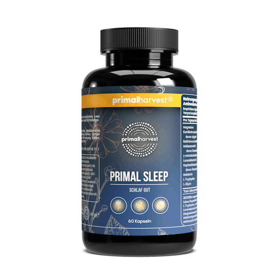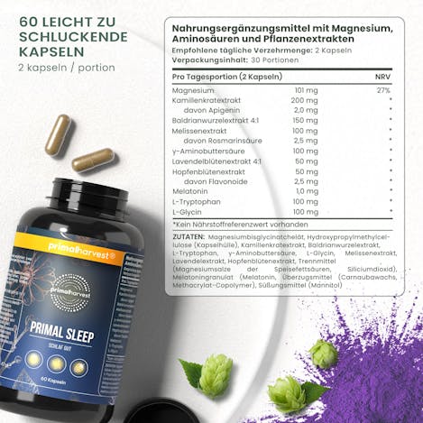 - Mit nur zwei leicht zu schluckenden Kapseln vor dem Schlafengehen bietet Primal Sleep – Schlaf Gut eine harmonische Kombination ausgewählter Inhaltsstoffe. Enthalten sind unter anderem Melatonin, Baldrianwurzel, Kamille, Lavendel sowie essentielle Aminosäuren.
